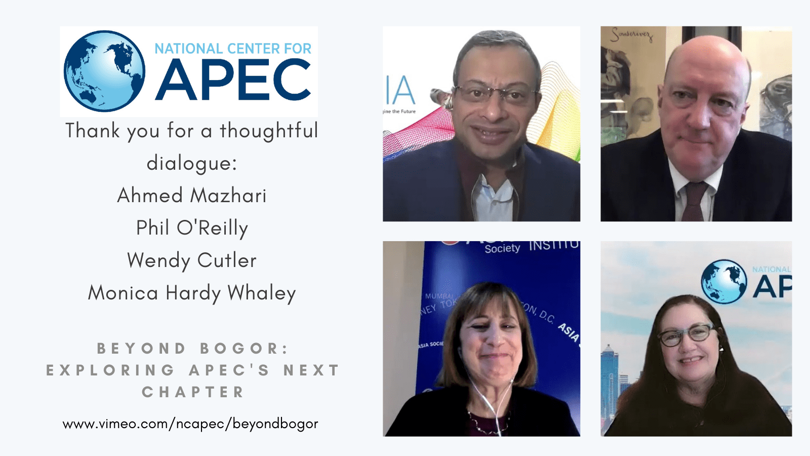 In lieu of the Annual Luncheon, NCAPEC held the four-part virtual discussion series to explore how the public and private sectors can collaborate to achieve the objectives of the new APEC Putrajaya Vision 2040. The series launched in December 2020 and concluded in early February 2021. Following the kick-off overview session, three events focused on the three pillars of the APEC Putrajaya Vision 2040: trade and investment; innovation and digitalization; strong, balanced, secure, sustainable and inclusive growth.