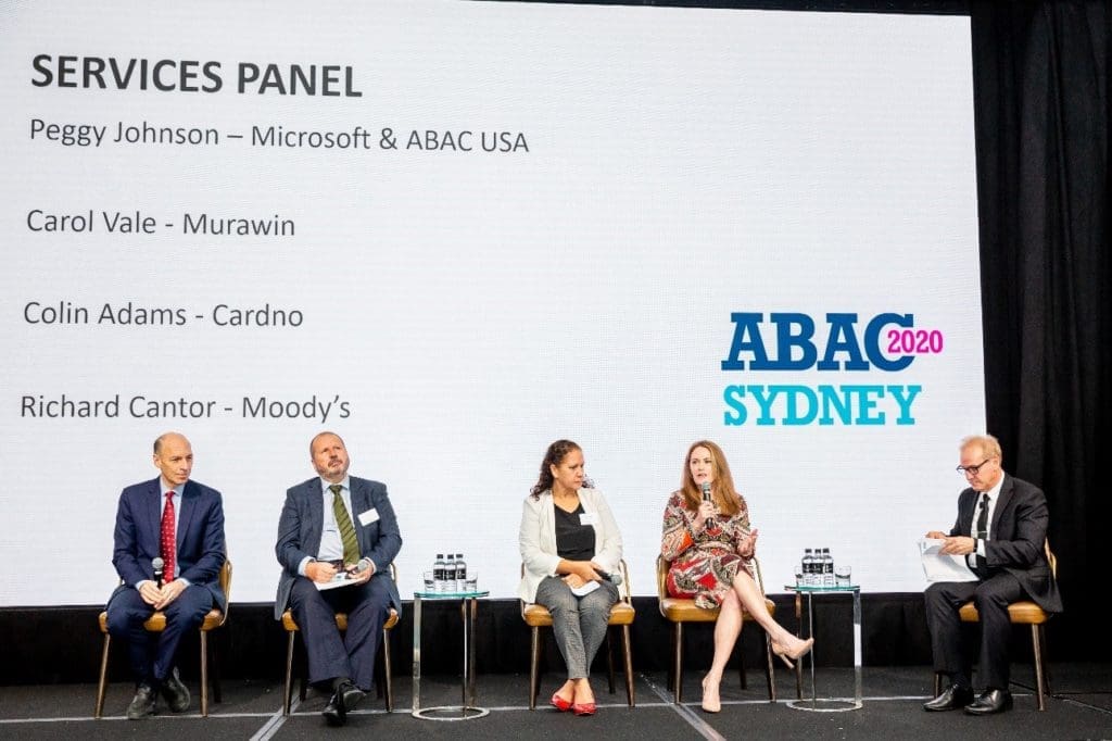 - ABAC USA member, Peggy Johnson of Microsoft (second from right) and former ABAC USA member, Richard Cantor of Moody’s (left) speak on a panel during the ABAC 1 meeting in Sydney, Australia.